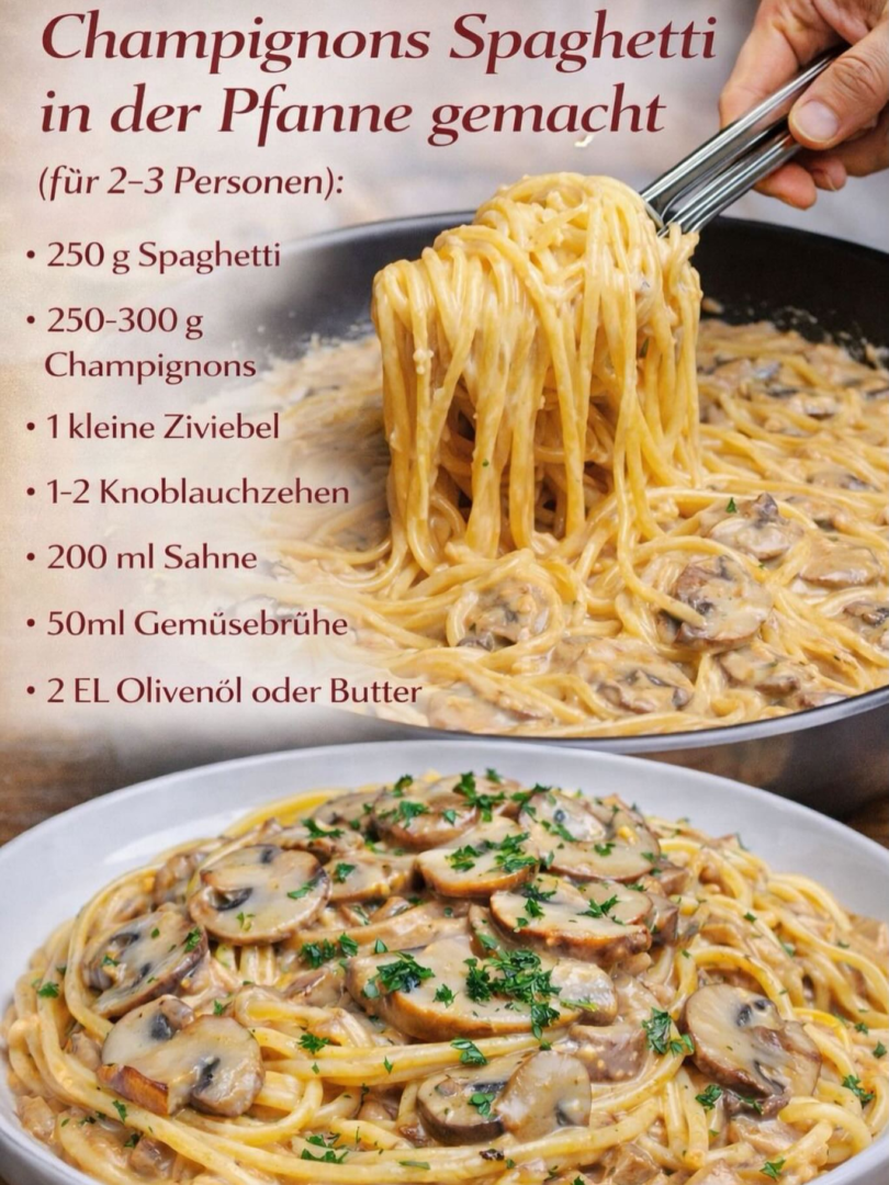 GemüseSpaghetti aus der Pfanne mit Champignons & Käse – cremig, würzig & einfach genial1 Woche agoAdd Commentby Chefin21 Views Written by ChefinZutaten300 g Spaghetti250 g Champignons (in Scheiben)1 Knoblauchzehe (in Scheiben)1 TL ThymianblättchenEtwas ButterSpeckwürfel (nach Wunsch)2 Eier200 ml Halbrahm (Sahne)Salz und Pfeffer50 g geriebener KäseBitte gehen Sie zur nächsten Seite oder klicken Sie auf die Schaltfläche „Öffnen“ (>), um die Kochschritte abzuschließen und vergessen Sie nicht, es mit Ihren Facebook-Freunden zu TEILEN. Page 1 of 2 Prev NextFacebookPinterest